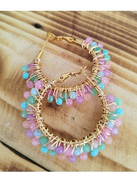 Pendientes de aro con bolitas decorativas en tonos turquesa y rosa.