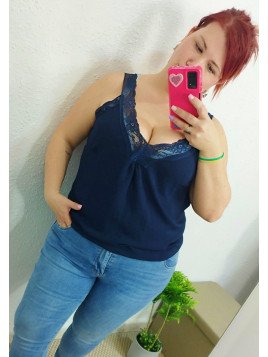 Lencera color azul marino con tirantes finos y escote bordado, diseñada con goma en la espalda para un ajuste cómodo. Talla única hasta una 50.