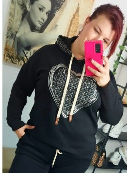 Sudadera con capucha color negro, estampado jaspeado de corazón en la parte frontal, mismo jaspeado en el borde de la capucha. Tejido punto neopreno.