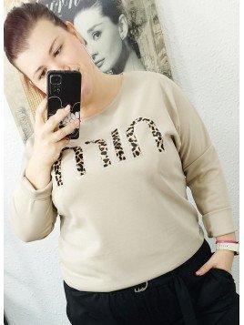 Presenta un diseño oversize, con cuello redondo, mangas largas y detalle de texto en el pecho con estampado animal print.